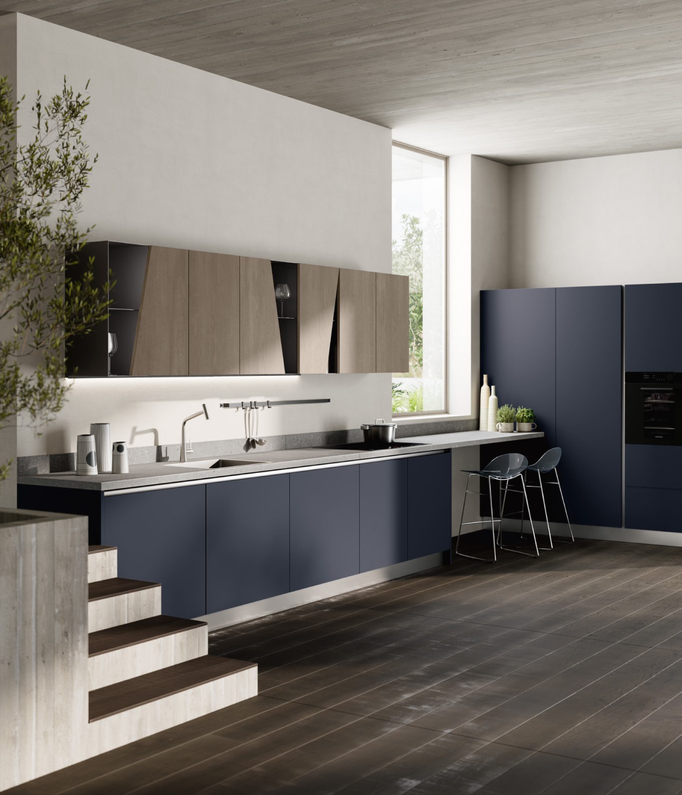 Jeometrica es el proyecto de decoración de Scavolini que destaca por el estudio y desarrollo de formas y líneas con un diseño gráfico en el que la memoria y la innovación interactúan en armonía. El diseño de la puerta con bastidor de 29 mm de espesor plasma un lenguaje contemporáneo, minimalista y elegante gracias a los perfiles de aluminio disponibles en dos coloraciones diferentes - Antracita y Titanio - y a la posibilidad de crear combinaciones con texturas muy llamativas con lacados en acabado mate, melaminas decorativas, enchapados, gres o cristal para maximizar la flexibilidad estilística.