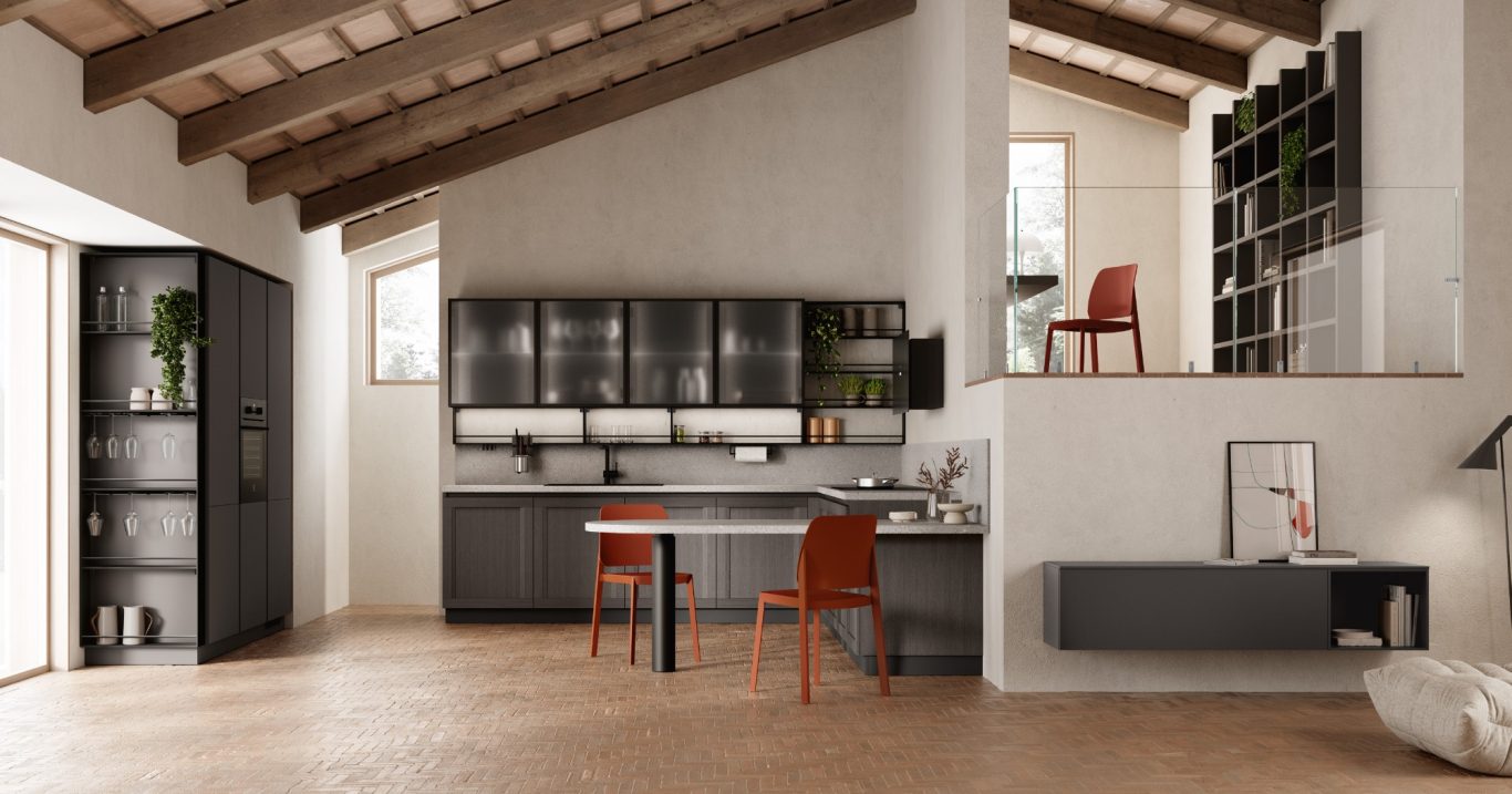 Puerta con bastidor con un carácter audaz, estructura abierta de metal de estilo urbano, muebles altos abiertos de metal y con bastidor de aluminio acabado Antracita con cristal Screen: son todos elementos que transmiten un agradable sabor técnico al corazón del hogar. Para composiciones con puerta lisa, también hay tres nuevas melaminas decorativas de color uniforme y la misma cantidad de melaminas decorativas con un interesante efecto cemento, acabados que visten la cocina con elegancia